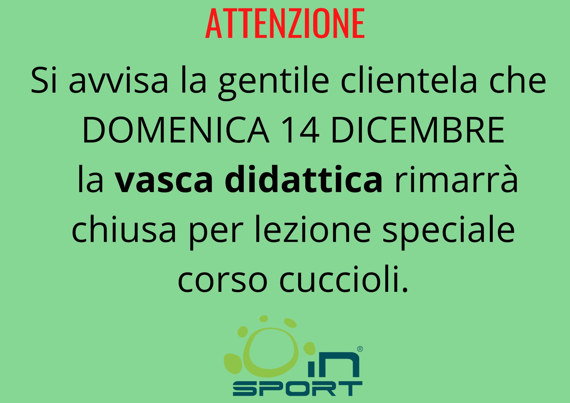 Si avvisa la gentile clientela che DOMENICA 14 DICEMBRE la vasca didattica sarà chiusa al pubblico per lezione speciale corso cuccioli.