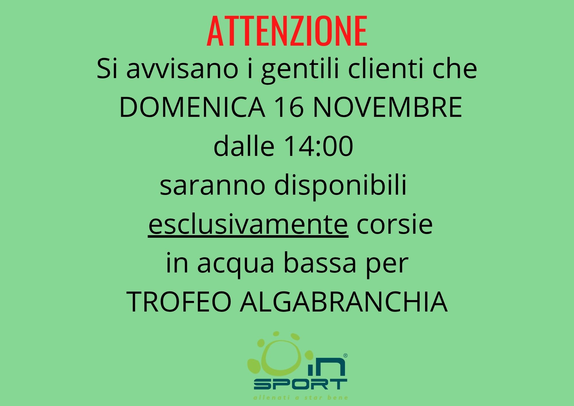 Si avvisa la gentile clientela che DOMENICA 16 NOVEMBRE dalle 14.00 saranno disponibili per il nuoto libero esclusivamente corsie in acqua bassa per svolgimento TROFEO ALGABRANCHIA nuoto sincronizzato.