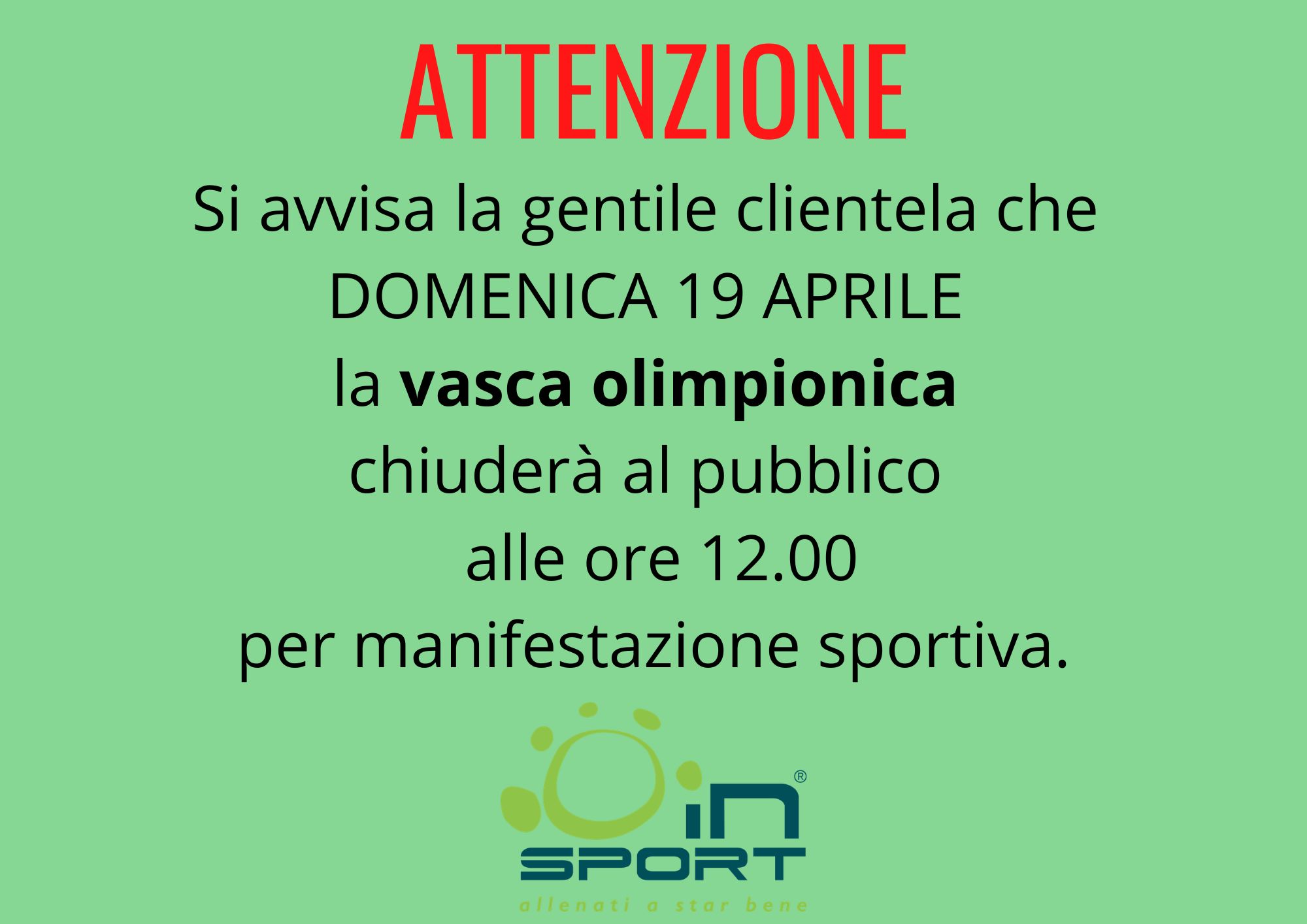 Si avvisa la gentile clientela, che DOMENICA 19 APRILE l’impianto chiuderà al pubblico alle ore 12.00 per gara di nuoto – NUOTIAMO.