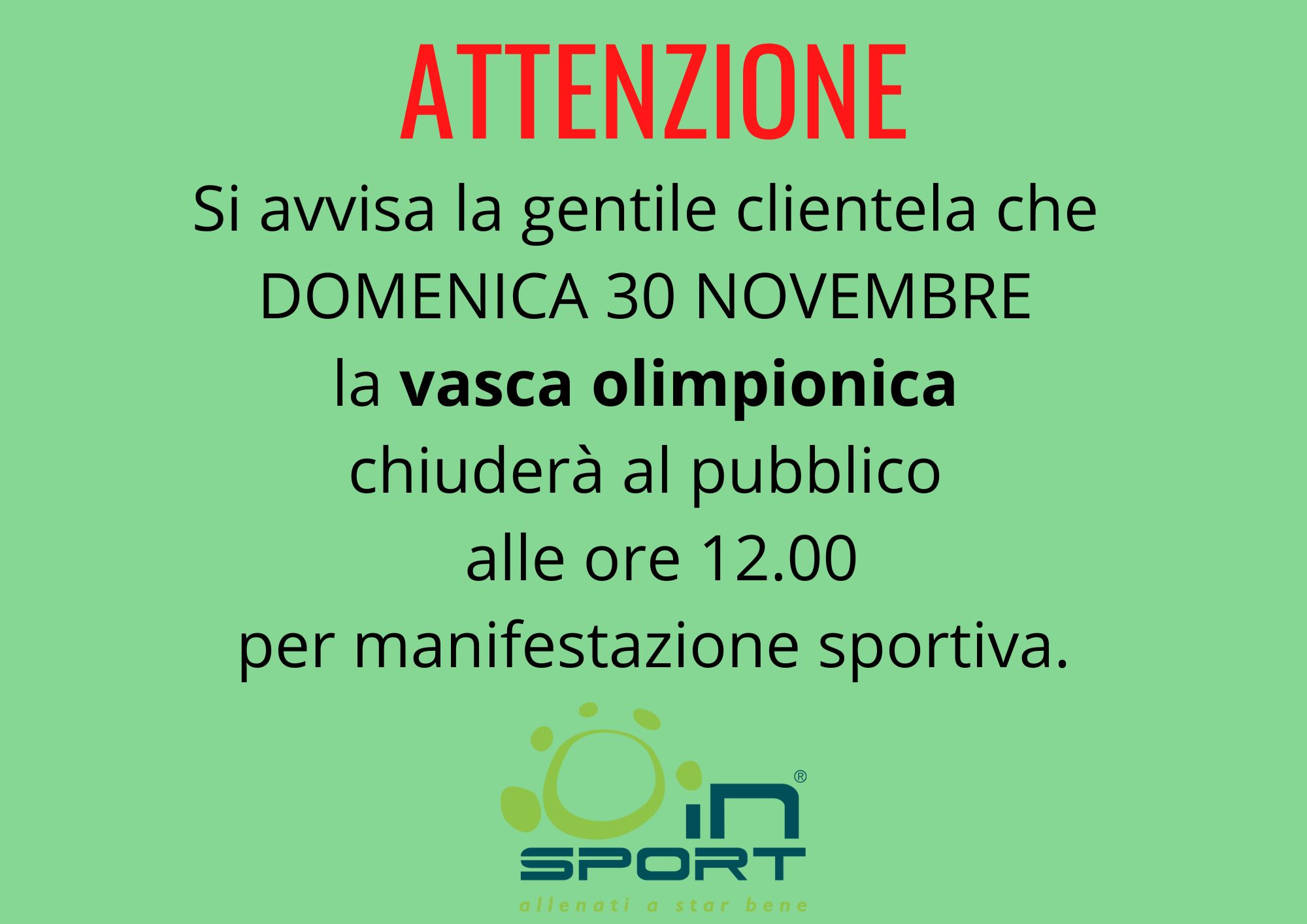 Si avvisa la gentile clientela che DOMENICA 30 NOVEMBRE la vasca olimpionica chiuderà al pubblico alle ore 12.00 per manifestazione sportiva.