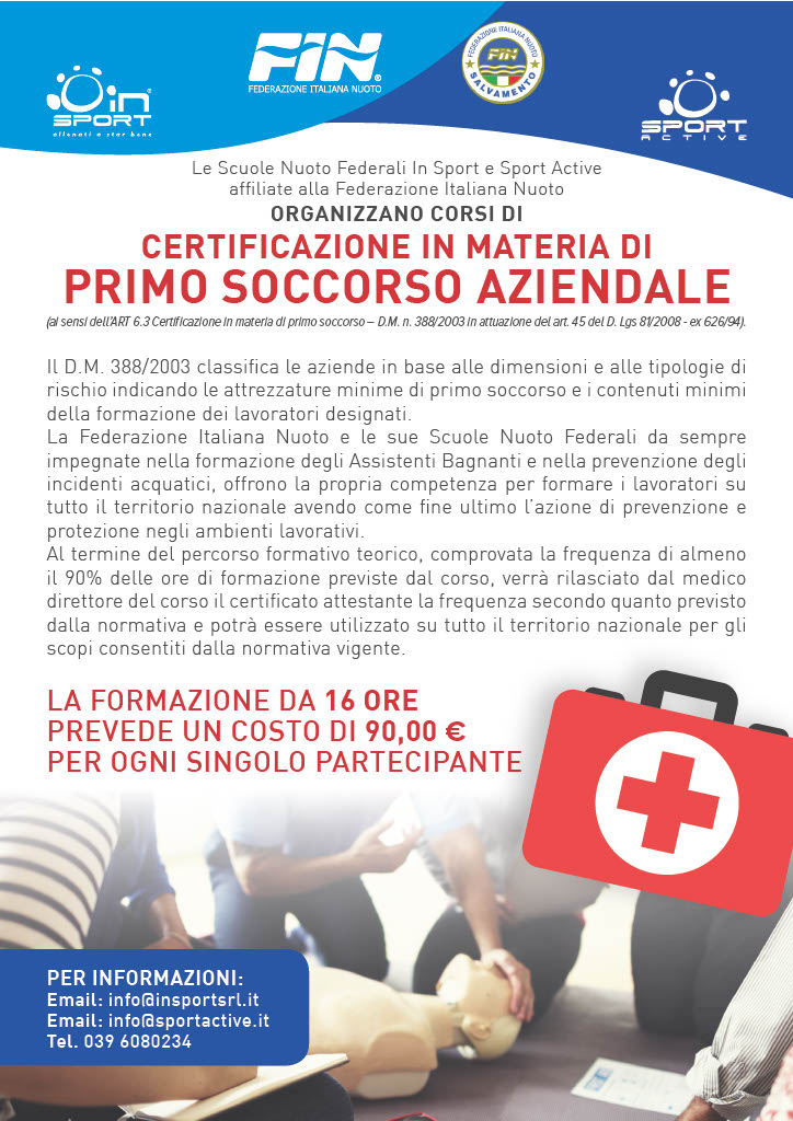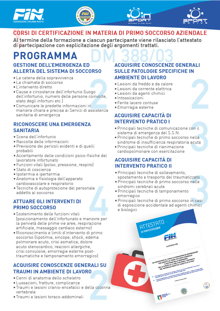 Il D.M. 388/2003 classifica le aziende in base alle dimensioni e alle tipologie di rischio indicando le attrezzature minime di primo soccorso e i contenuti minimi della formazione dei lavoratori designati. La Federazione Italiana Nuoto e le sue Scuole Nuoto Federali da sempre impegnate nella formazione degli Assistenti Bagnanti e nella prevenzione degli
