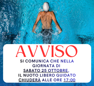 VARIAZIONE NUOTO LIBERO GUIDATO Si avvisa la gentile clientela che SABATO 25 OTTOBRE 2025 il nuoto libero guidato chiuderà alle ore 17:00 per evento.